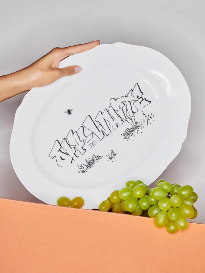 Featured on the full tableware set of dinner plates, serving platters, a teapot, and a tea cup saucer set are graffiti-inspired scrawls of words such as 'Off' and 'Off-White', giving the collection a bourgeois-slash-street art mashup.