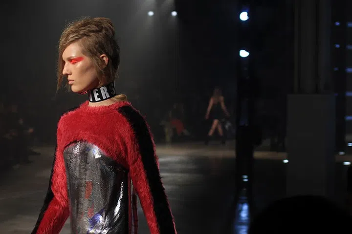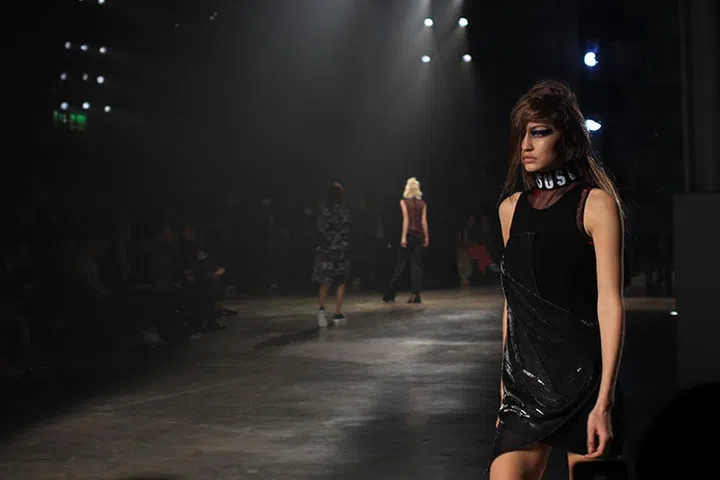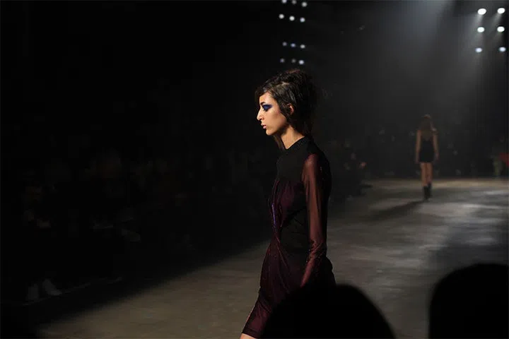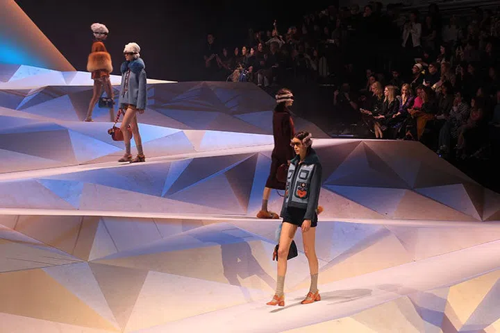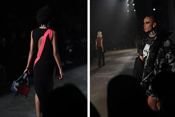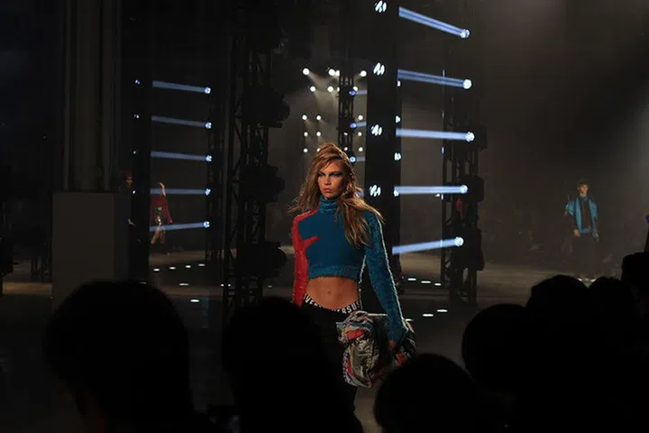 "The Versus show space was transformed into an arena with the audience facing a light installation that mimicked cages as the models walked the runway."