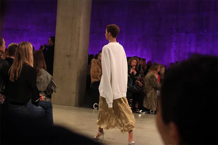"One of my favourite combination for lazy dressers like me at the Topshop Unique show: Hoodies with oversized sleeves and an embellished feminine skirt."