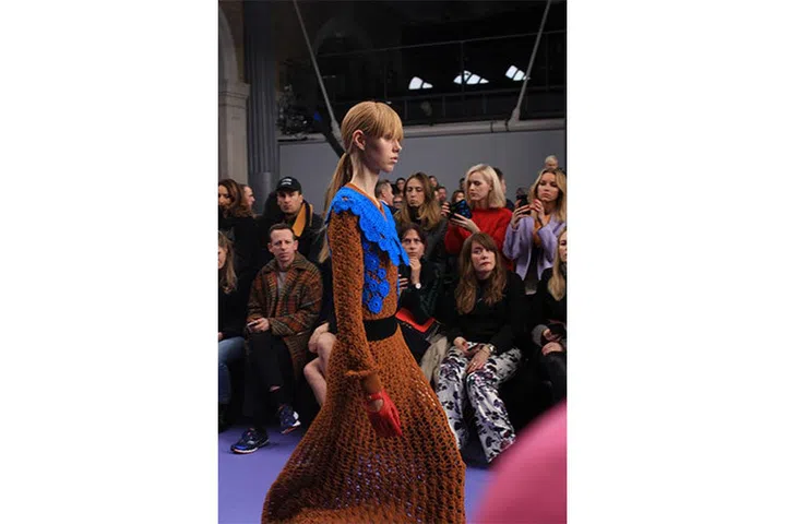 "Roberta Einer encapsulated her maximalist vision of a Mediterranean winter in the form of '40s cut dresses, au naturel makeup looks of glossy lips and curly hair and embellished everything (on leather gloves, socks, dresses and even the yoke of a wool coat). Inspired by Portuguese poster art as well as the study of moths, dragonflies and butterflies, the Estonian-born, London-based designer recreated these visuals in the form of illustrations on her trademark bomber jackets - a combination of awkward meets quirky."