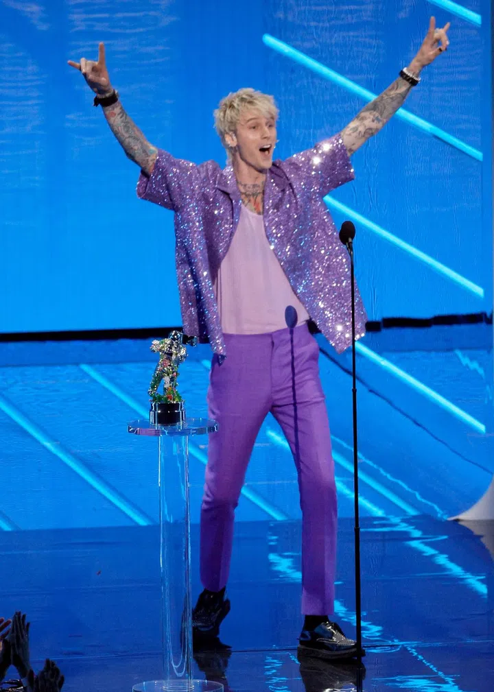 Machine Gun Kelly accepted the Best Alternative award for My Ex's Best Friend in sequinned look from the Valentino Haute Couture Fall/Winter collection.