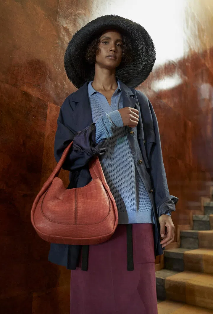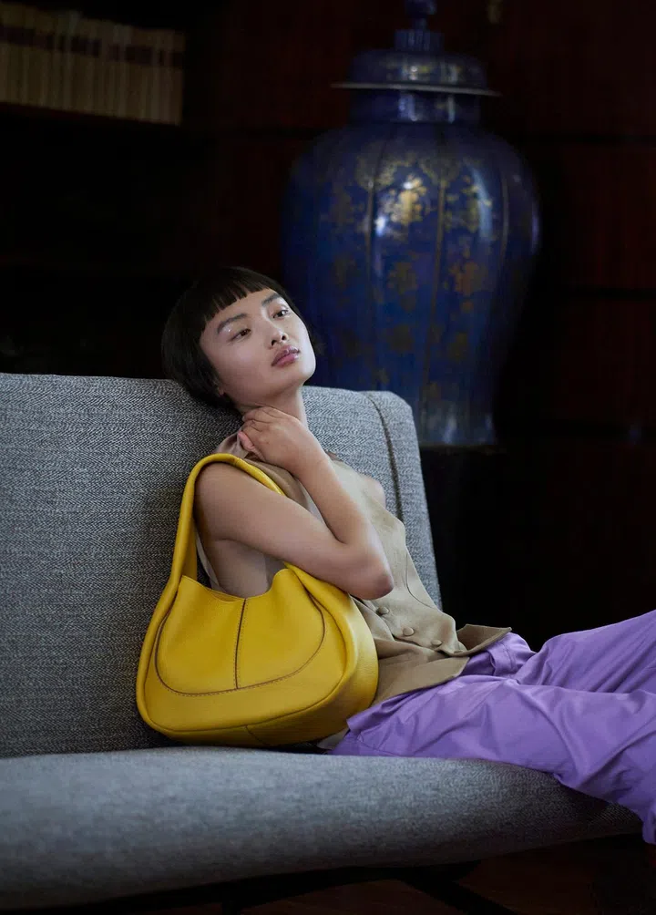 “I’m in love with the Shirt bag (which comes as a day-friendly hobo or shopper, both with organic lines and zero hardware) because of its softness and deconstructed shape. And, of course, the Oboe (another hobo with a supple finish that belies its graphic, geometric silhouette) because it is exactly the expression of my vision: a very classic shape reinterpreted with fancy colours and leathers, and simple yet sophisticated details (its only hardware is the brand’s Timeless T logo in metal on the loop of the shoulder strap).”