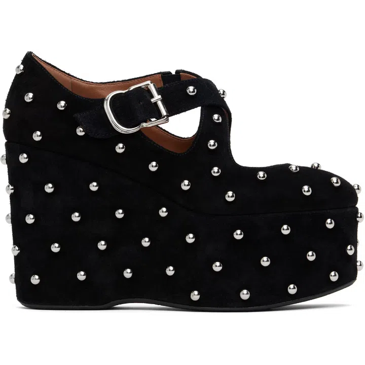 A striking black with metallic polka dots, these Mary-janes-meet-wedges take it to show-stopping heights.