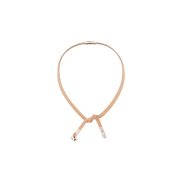 Designed by Hermes' creative director of jewellery, Pierre Hardy, the Kellymorphose line is a celebration of the Kelly bag and its most recognizable motif: the clasp. The Kelly Gavroche necklace is an interpretation of the Kelly bag's strap, with the form inspired by the fluid movement of the scarves Hermes is renowned for.