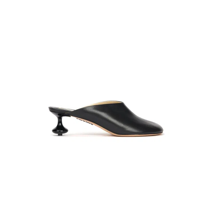 Loewe has become known for their quirky approach to shoes, by crafting heels in the shape of bars of soap or nail polish bottles for a little shock factor. That tradition continues this season with this pair of slip-on mules with heels that reminds us of a chess piece.