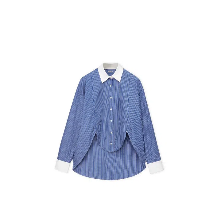 Upgrade your rotation of oversized button-up shirts with this plastron-shaped shirt that has a curved hemline for some added drama.