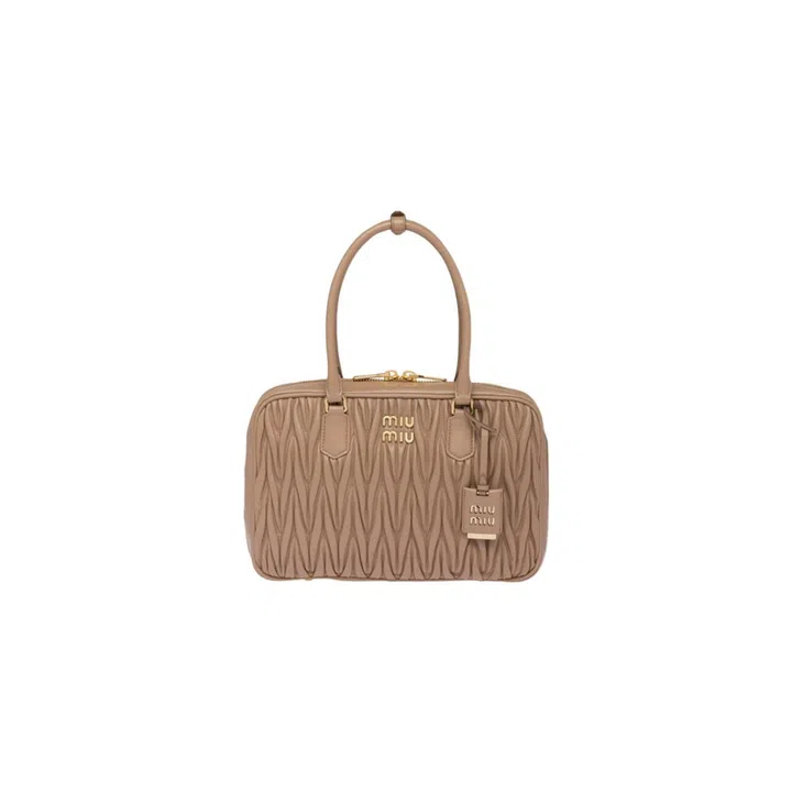 The textured, three dimensional Matelasse quilted motif is a signature design of Miu Miu's and is an attribution to the spunky energy of the brand.
