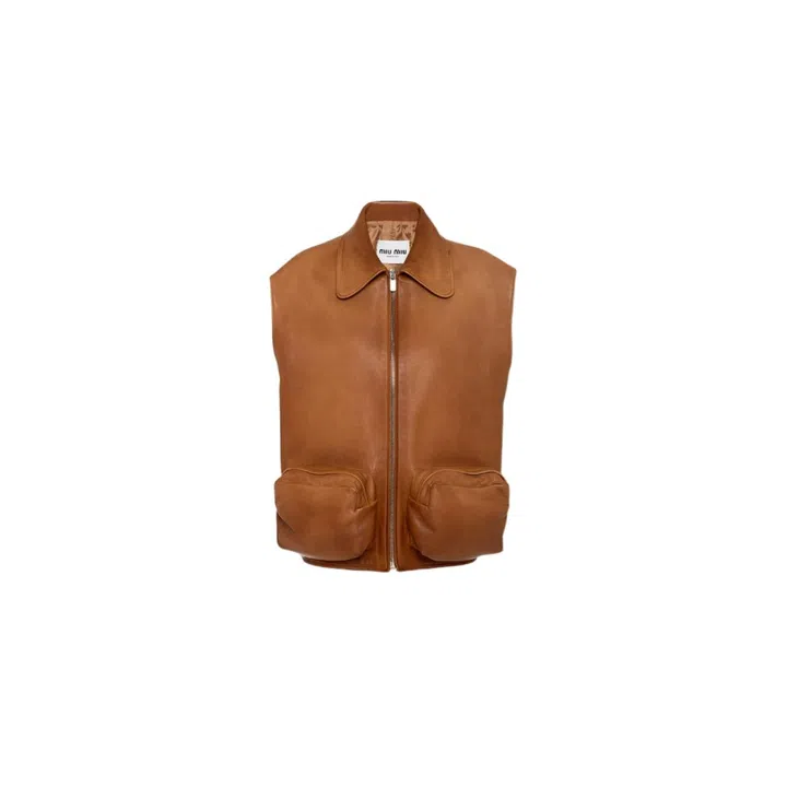 We're digging the vintage feel of the caramel-coloured leather vest as much as we are the two zipper pouch-like pockets.