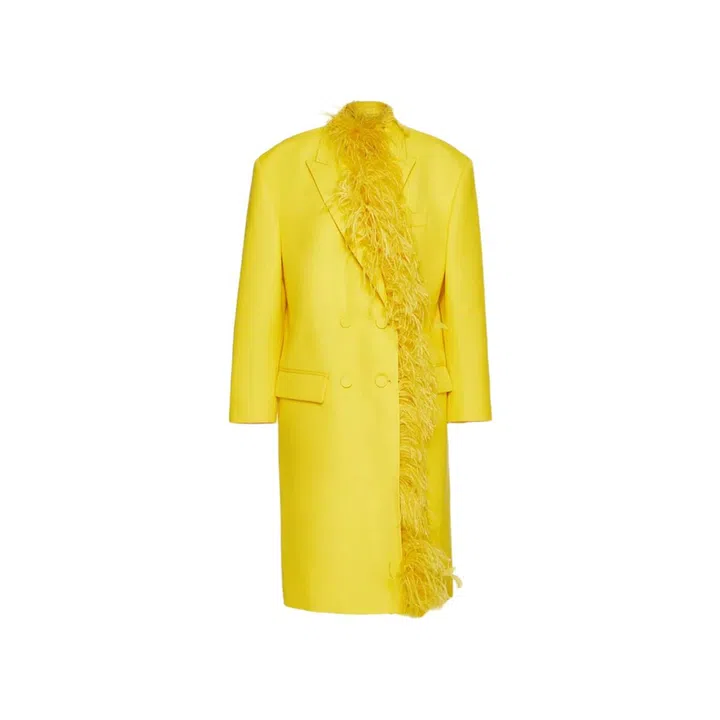 This sunshine yellow long coat is lined at the opening with removable feathers and lined with pure silk.