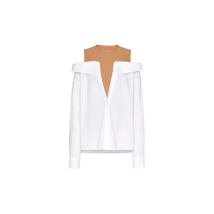 The inner bodysuit helps to create the illusion that the white outer shirt is slipping off your shoulders when worn. The shirt also comes in a ebony and light camel colour.