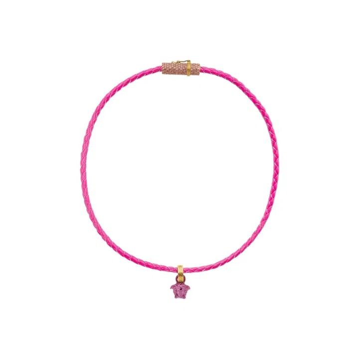 Besides hot pink, this braided leather necklace with a tiny La Medusa-shaped crystal pendant also comes in black and acid green.