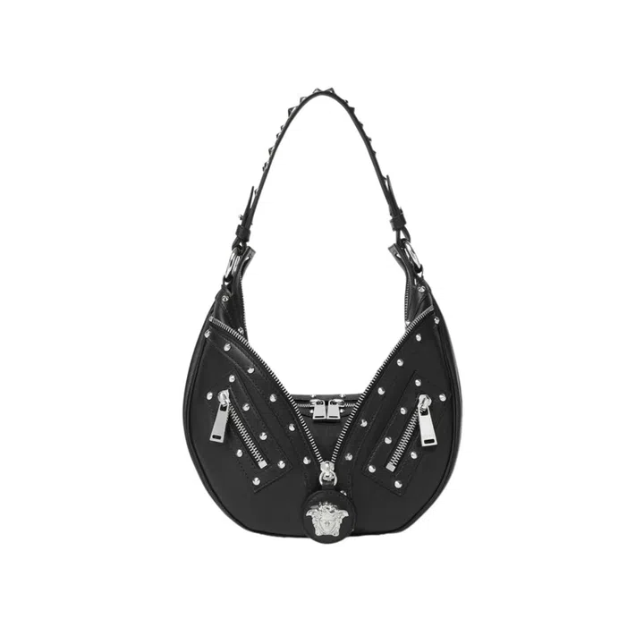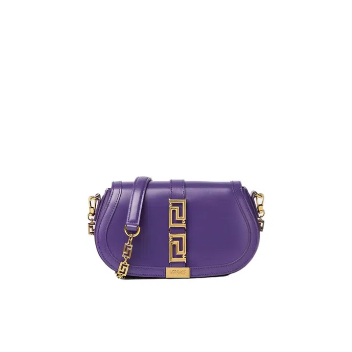 Greek mythology and symbols have long been a part of Versace's design lexicon. This bag features a chain hardware on the flap and along the shoulder strap that has been sculpted in the shape of the brand's popular Greca motif.