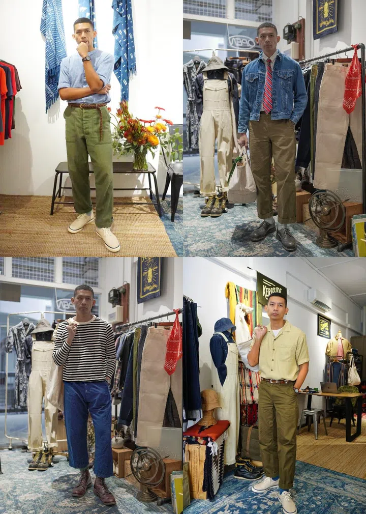 On Singapore’s workwear scene: “People here don’t accessorise enough. There are so many ways you can change up a look: A vintage bandana adds personality, for example, and you can always opt for a chambray shirt, instead of a plain T-shirt, and jeans. Add metal cuffs or necklaces from (legendary Japanese silversmith) Goro’s, or a mechanic’s hat. People also tend to think that workwear equates to boots, but we think that a nice pair of brown loafers is better.”