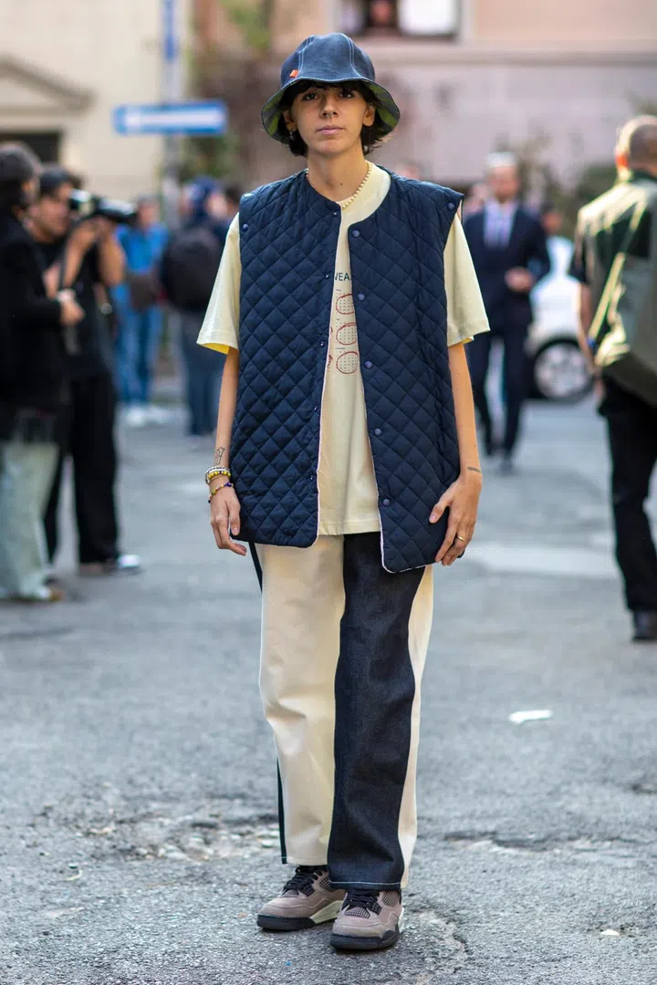 A Fashion Week attendee at the Sunnei Spring/Summer 2023 show, dressed in some of workwear's must-have items.
