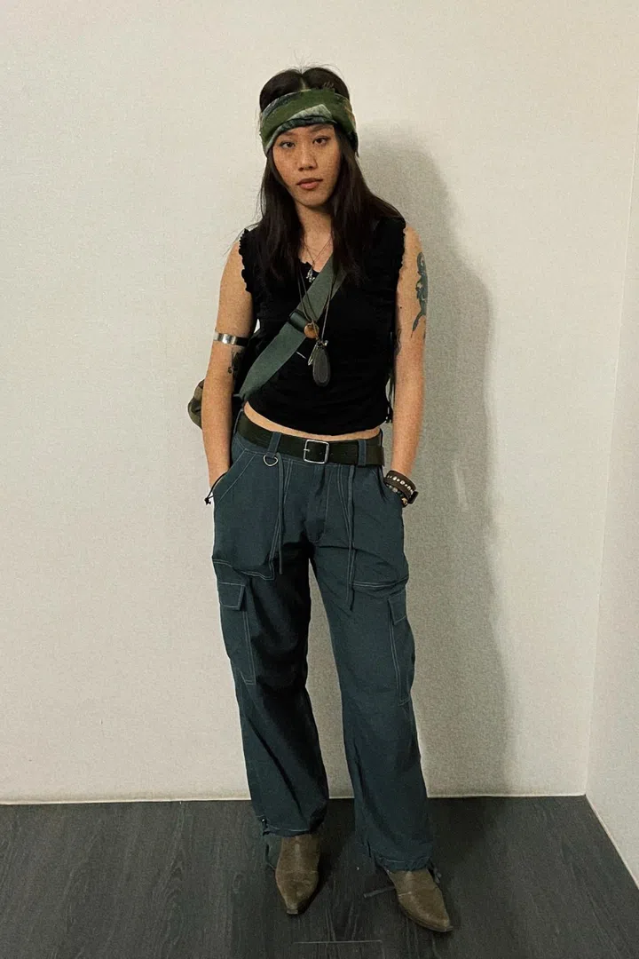 What she is wearing: Thrifted top, bandana, bag and cowboy boots; cargo pants from @summershit_; The Polska Traveller necklace; and Diesel belt