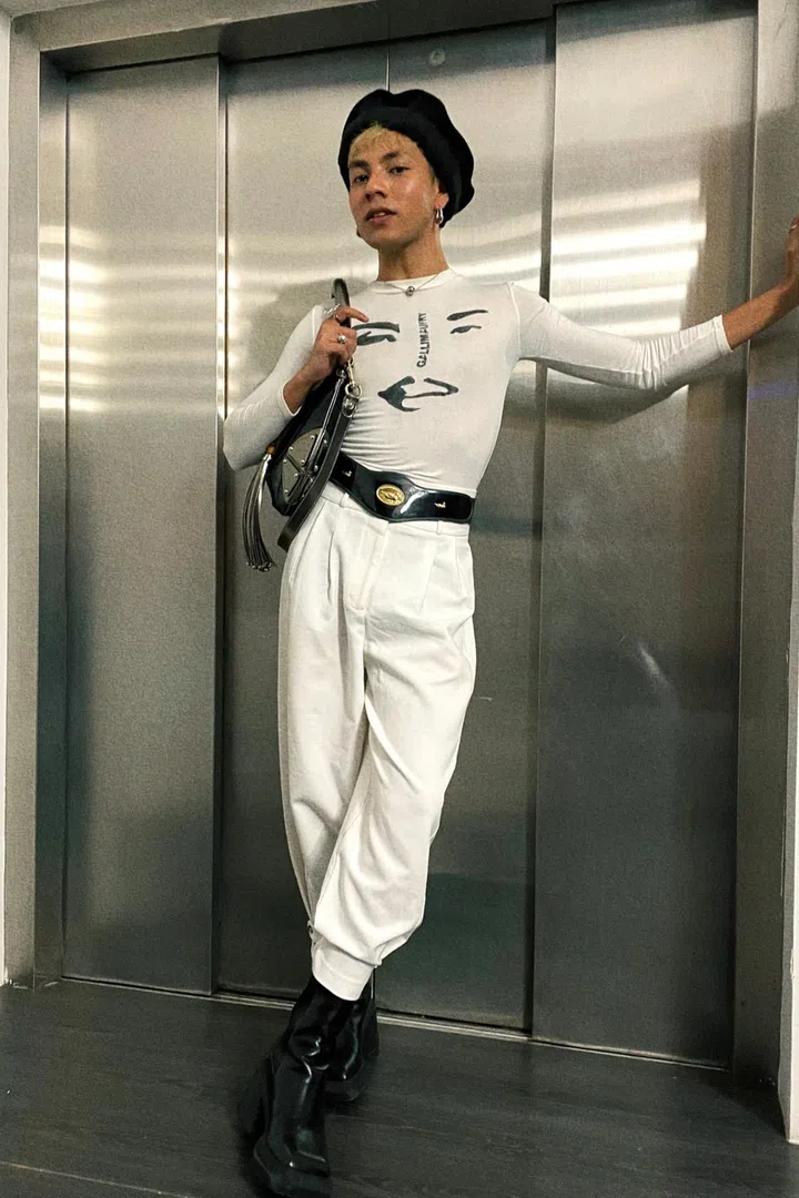 What he is wearing: Cardigan and belt bought in Paris; top gifted by his friend; thrifted Pomelo pants; hat borrowed from his brother; jewellery from Taobao; vintage Gucci bag; and Charles & Keith boots