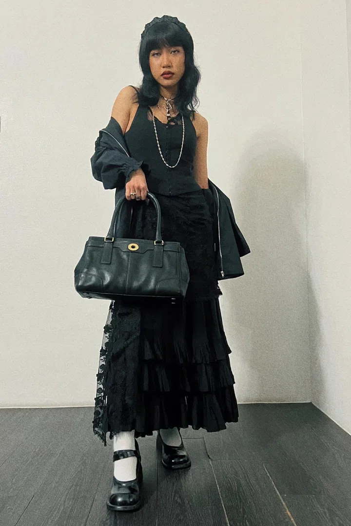 What she is wearing: HeiHei jacket; I.Am.Gia corset; dress from Depop; Ralph Lauren skirt; & Other Stories headband; necklaces from Etsy and First Arrows; a mix of jewellery that she handmade, gifted by her mum or bought from Blackup Korea or Hysteric Glamour; thrifted Coach tote bag from Carousell; and Unif shoes