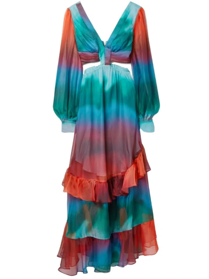 PatBO makes the cutout dress a lot more romantic with its cheery hues in chiffon and ruffles. Elevate the look with a sleek bun hairdo, dangly earrings, a dainty handbag and pumps for a night out.