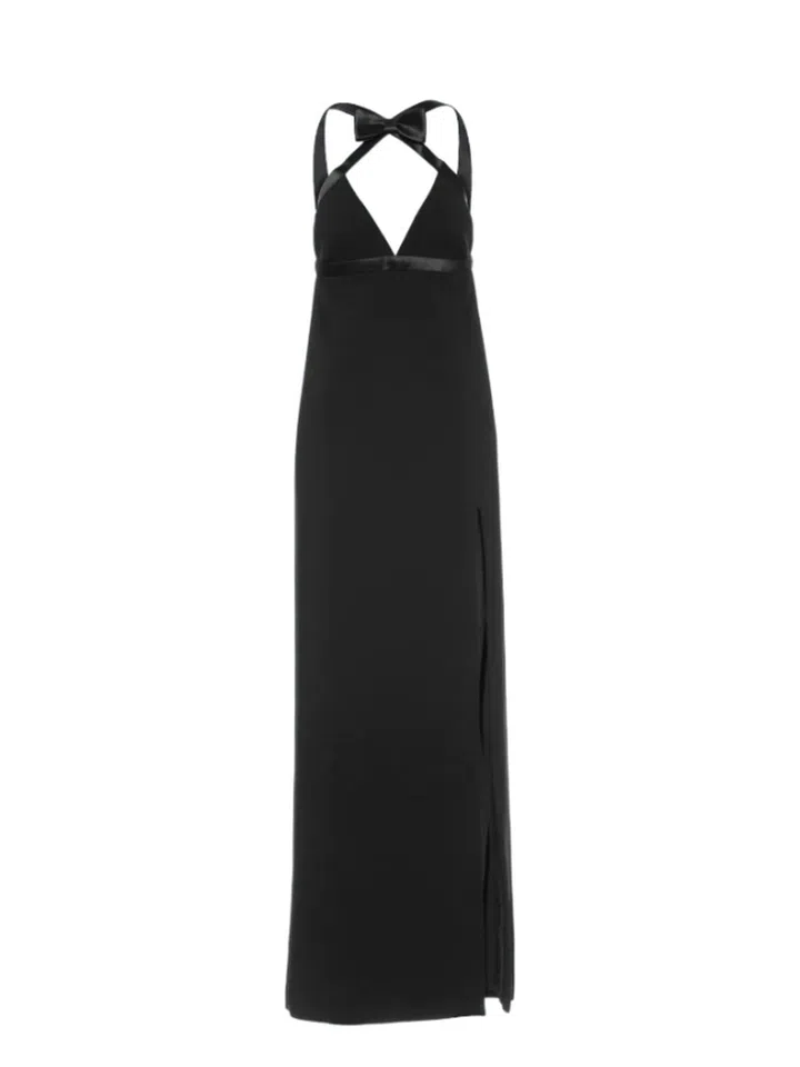 Get decked out in this ladylike cutout gown from Miu Miu that accentuates the décolletage with a chic criss-cross design and Duchesse satin bow detail.