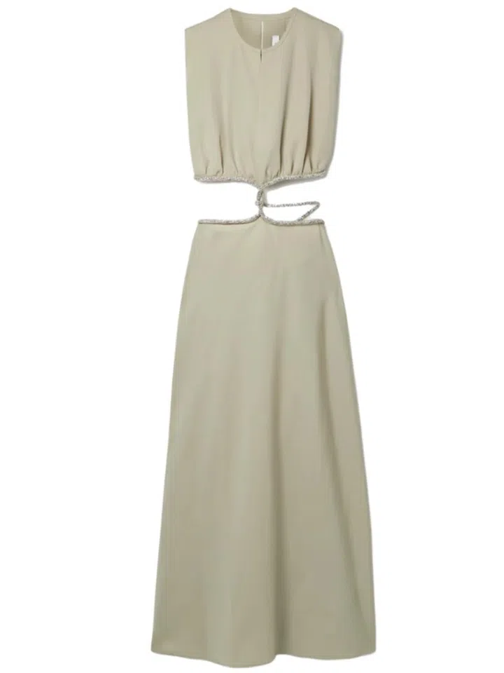 If you’re all about dresses that exude effortless glamour, this Christopher Esber cutout gown is the one for you. The neutral beige tone with crystal embellishments along the mid-riff cutout is subtly elegant and will complement your accessories perfectly.