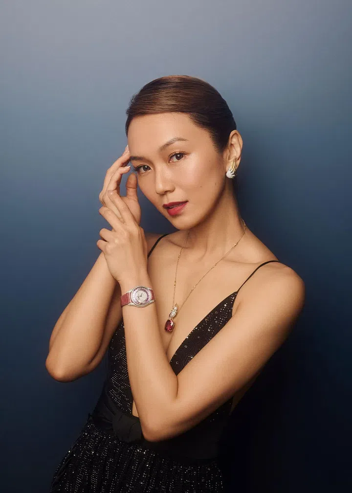 Joanne Peh kept things pared-back but powerful in a black embellished gown and jewels that quietly stole the show. She wore a Jean Schlumberger by Tiffany & Co. pendant featuring a rubellite, diamonds and pink sapphires, paired with the matching pink sapphire and diamond watch, and Flame ear clips that brought major sparkle and elegance.
