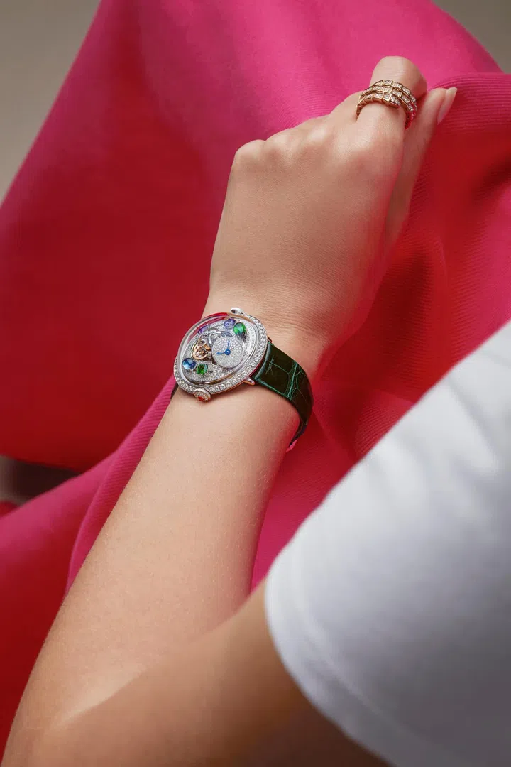 First introduced in 2019, the FlyingT is distinguished by its vertical movement architecture, rising up beneath a tall domed glass that gives the watch an impressive height of 20mm. While the domed glass was used so there would be sufficient space for the vertical movement — topped by a flying tourbillon, no less — as well as a 50 degree-angled dial that allows only the wearer to see the time, we love that Bulgari has decided to use that ample real estate to display several sizeable colourful gemstones as well.