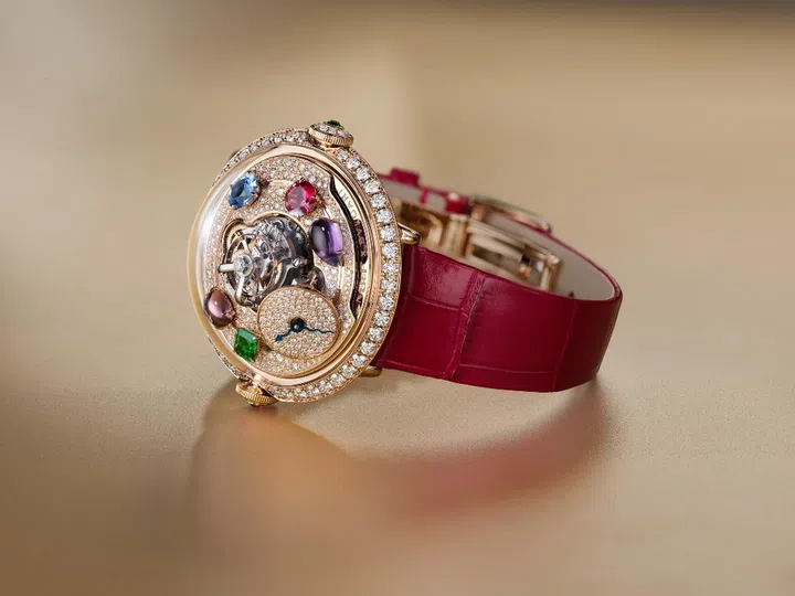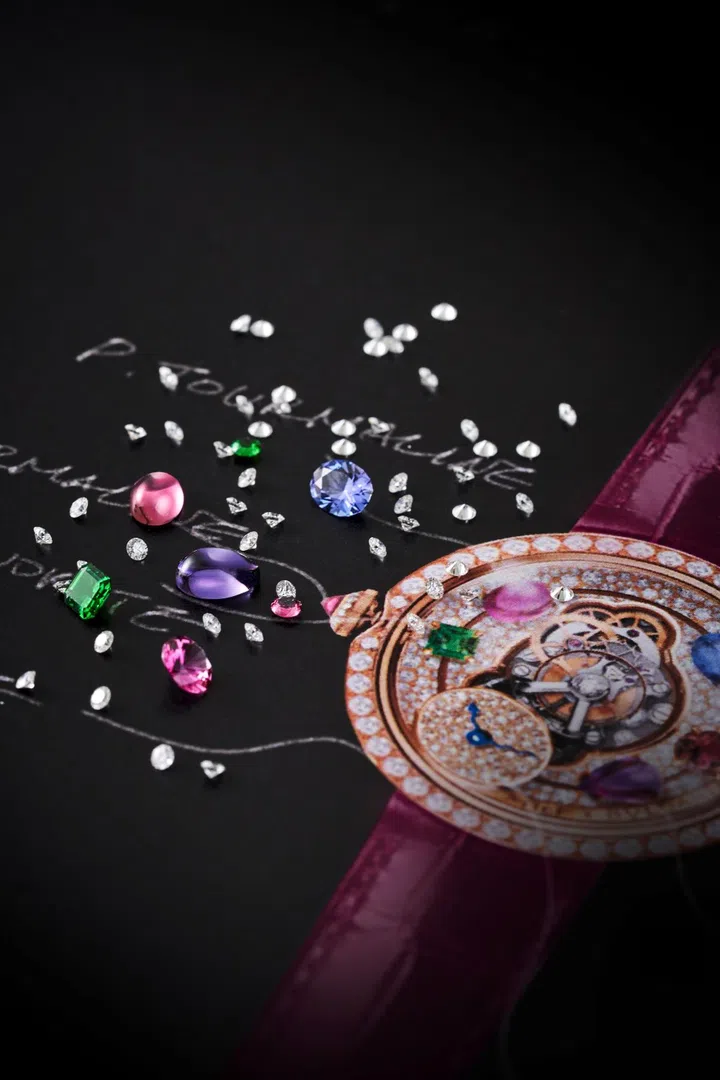 Nonetheless, when it comes to glitz, few brands do it as stunningly as Bulgari. The Legacy Machine FlyingT Allegra features a case that has been redesigned by Bulgari so it looks even more rounded and voluminous, with hidden, shorter lugs. Made in white gold (20 pieces) or rose gold (20 pieces), each timepiece includes sizeable tourmaline, tsavorite, diamonds, rubellite, amethyst, tanzanite and topaz, surrounding the movement and set on a dial entirely paved with snow-set diamonds.