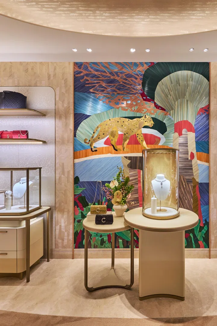 A feature wall featuring the iconic Cartier panther and Gardens by the Bay greets you as you enter the Cartier store.