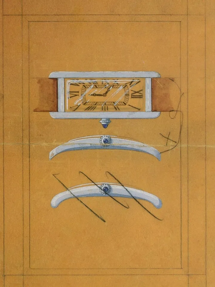 From the Cartier New York Archives (1935): A design for a large platinum tank watch that was purchased by Princess Louise Van Alen Mdivani.