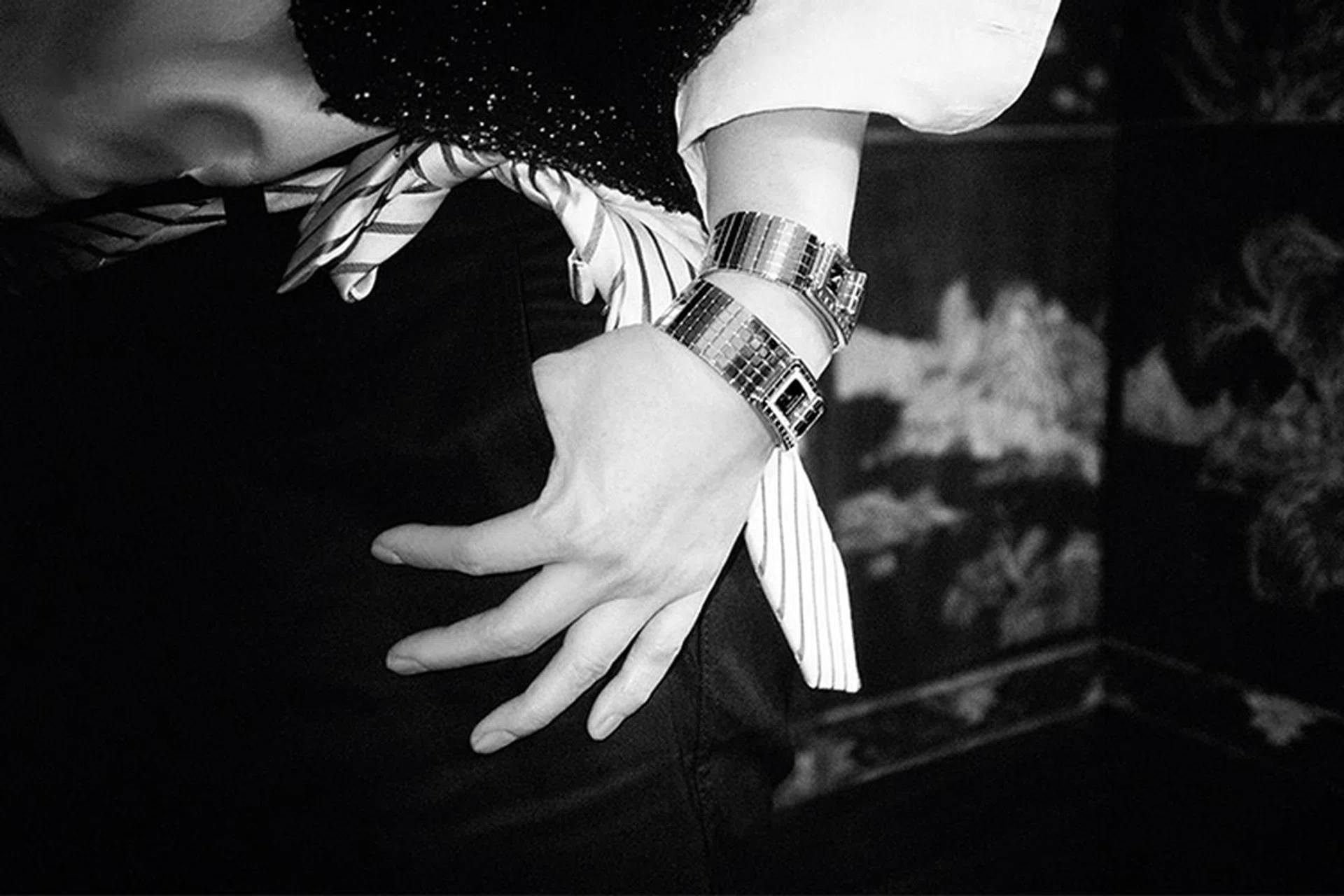 Debuting in steel and a plain or full-diamond bezel, the Code Coco is an elegant-meets-edgy bracelet watch that adapts not only the quilted finish of Chanel’s 2.55 handbag, but also its clasp. The latter reveals the black dial only when closed, thanks to the timepiece’s innovative and supple wraparound strap.