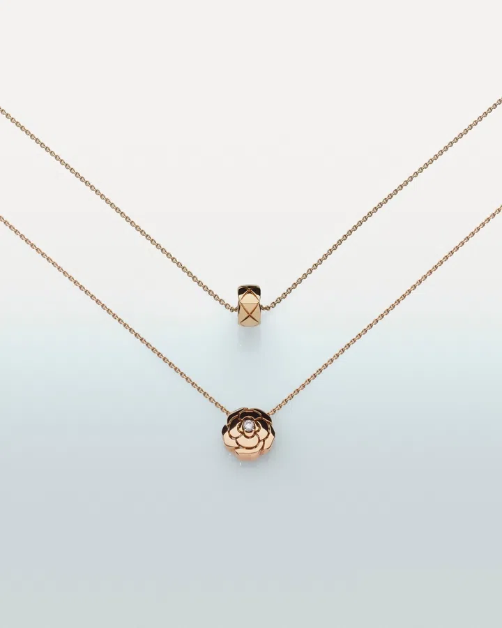 For starters, this 18k gold necklace adorned with the house of Chanel’s iconic camellia, is transformable and can be worn as one wishes: as one long necklace, layered, or a pendulum. While a 18k gold choker with the floral charm encircling the neck easily stacks with a dainty camellia or C-shaped pendant necklace.
