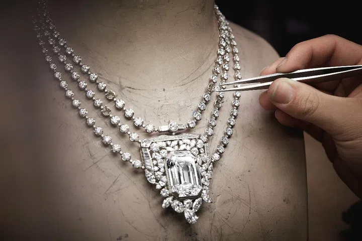 A 55.55-carat emerald-shaped diamond is the centrepiece of this one-of-a-kind necklace.