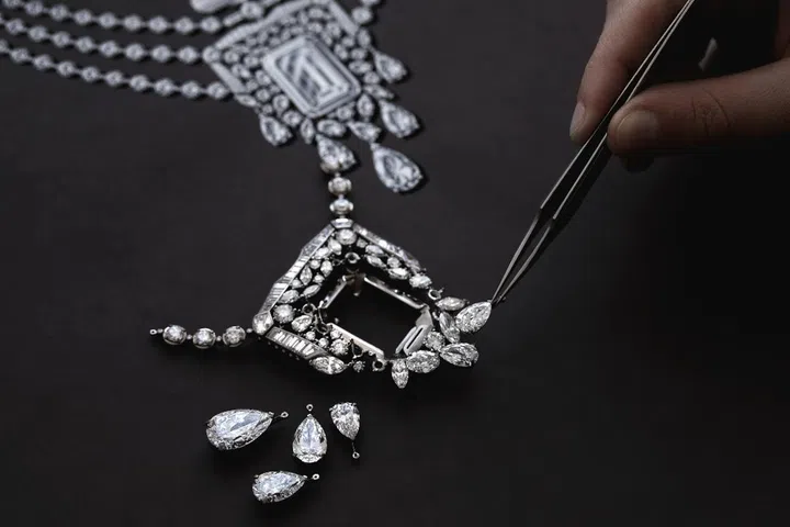 Talk about technical expertise. Patrice Leguereau, the director of the Chanel Fine Jewellery Creation Studio, reveals that his team was not obsessed with getting the biggest stone possible, but rather "to obtain a perfect octagonal diamond". Indeed, according to Frederic Grangie, president of Chanel Watches and Fine Jewellery, one of the most intense moments in the necklace's production process was cutting the rough stone to its final weight of 55.55 carats.