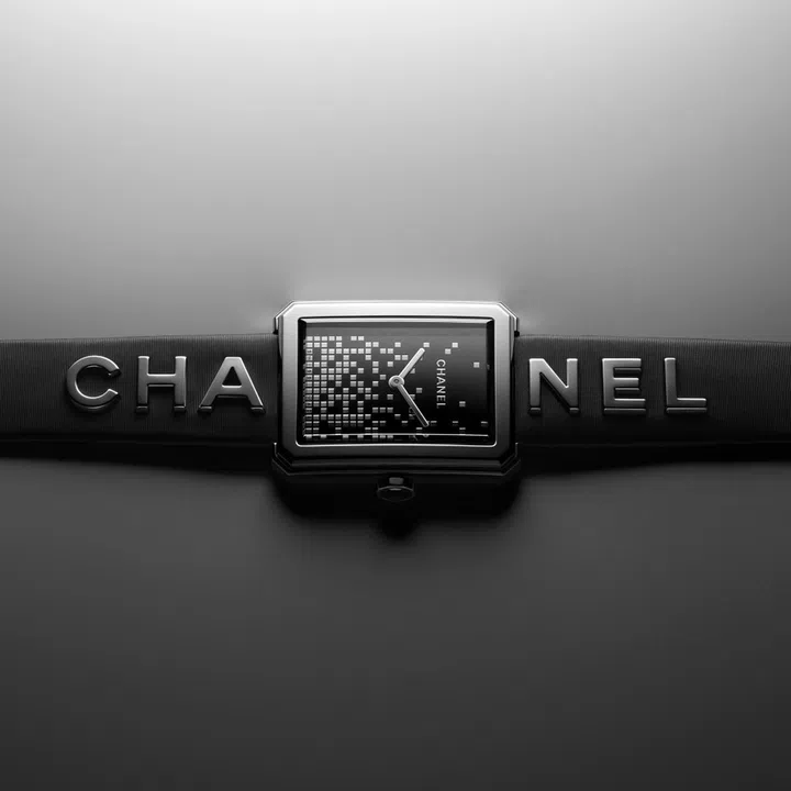 The Boy.Friend timepiece features palladium-treated 'Cha' and 'Nel' motif riveted on each side of the calfskin strap. To complete the '90s vibe of the collection, the black lacquered dial has been decorated with a pixelated design made from rhodium-plated metal.