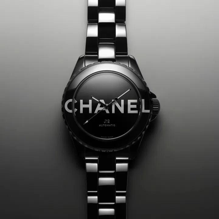 This glossy all-black ceramic automatic ticker features a large white 'Chanel' slogan printed across its 38mm case, with the first two letters sitting on the steel bezel and the rest of the letters encased within the black lacquered dial.