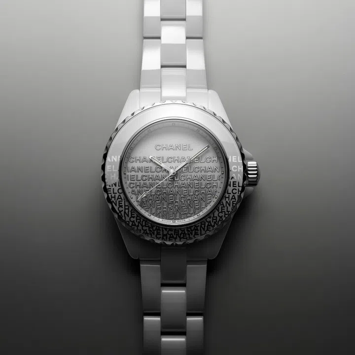 At 33mm, this white J12 model is slightly smaller than its black counterpart. And unlike the latter, the 'Chanel' motif is rendered in a tinier proportion, appearing as embossed rhodium-plated metal stickers on the white lacquered dial and metallic silver prints on the steel and sapphire crystal bezel.
