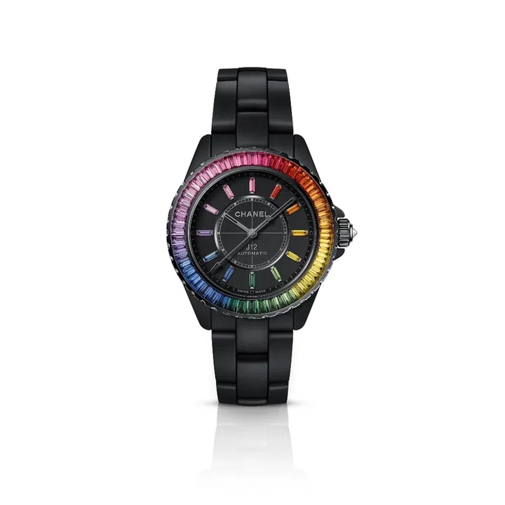 Produced in a limited run of 1,255, this black high-tech ceramic automatic rendition of Chanel's iconic J12 model gets a much-needed punch with rainbow-hued indicators on its all-black dial.