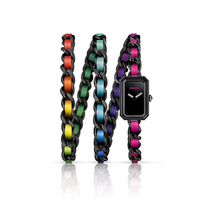 Combine your love for chain jewellery and chic timepieces with this quartz watch. The design features a rainbow leather strap interwoven into its ADLC-treated triple-row bracelet. To give the watch more oomph, a black lacquered dial is adorned with the Chanel logo in neon pink. Only 555 pieces are available.