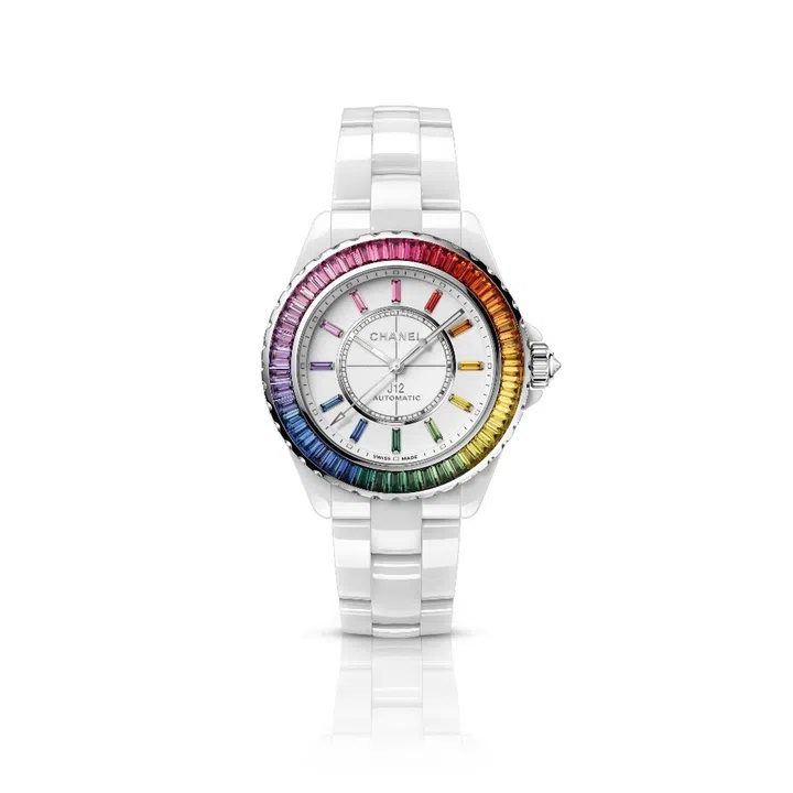 The J12 Electro Dream is also available in a white ceramic version. If the black version exudes an after-hours glamour, then this white version is a jaunty style made for the day with its rainbow-hued sapphires on the bezel and hour markers. Like the black version, this piece is also limited to 55 pieces.
