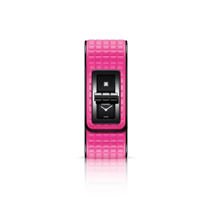 One of the newest watch lines in Chanel's stable of timepieces, the Code Coco is known for its graphic-slash-minimalist take on the quilt motif for its sleek bracelet design. This year, the quartz-powered watch has been given a maximalist update in a neon pink calfskin bracelet with black trim and lining. The steel case, meanwhile, has been coated in black ADLC to give the timepiece a rocker chic vibe. Limited to 255 pieces.