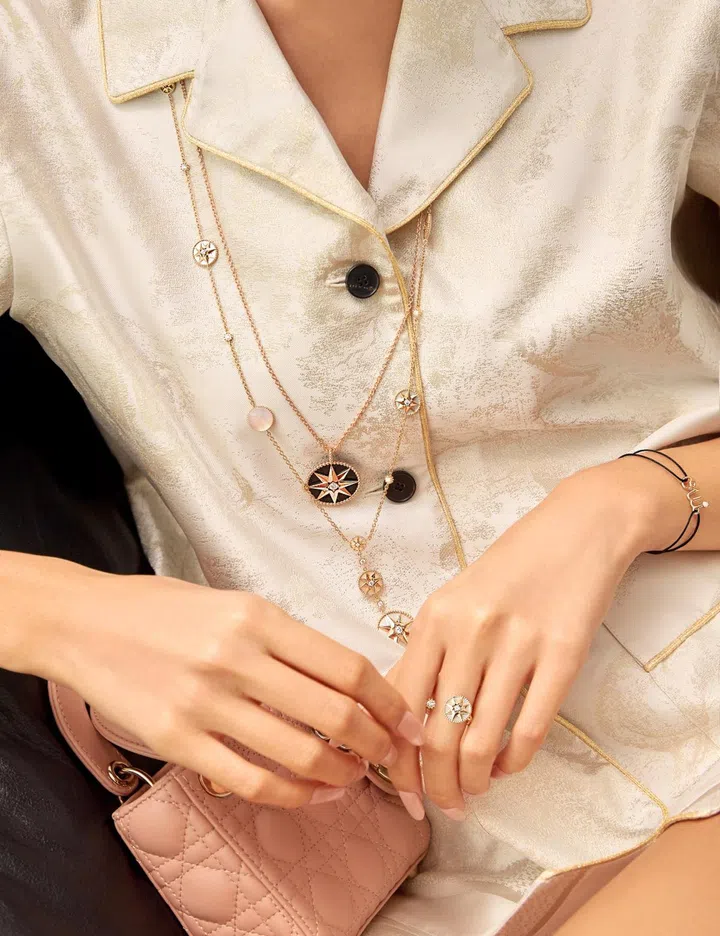 Rose des Vents Medallion pink gold pendant with onyx and diamonds; Rose des Vents yellow gold drop necklace with mother-of-pearl and diamonds, and matching ring; Oui yellow gold charm with diamonds on cord bracelet; silk pyjama shirt and Lady Dior micro leather bag, Dior