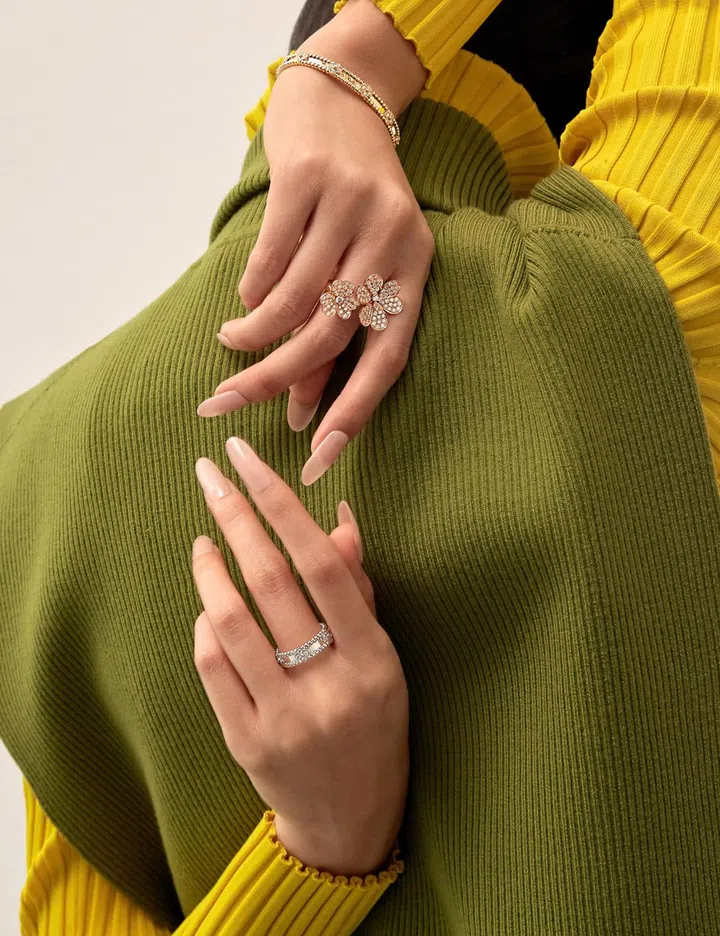 Perlee Sweet Clovers yellow gold bracelet with diamonds and (on left third finger) matching white gold ring with diamonds; and Frivole Between The Finger rose gold ring with diamonds, Van Cleef & Arpels. Wool tabard and polyester turtleneck top, Tory Burch