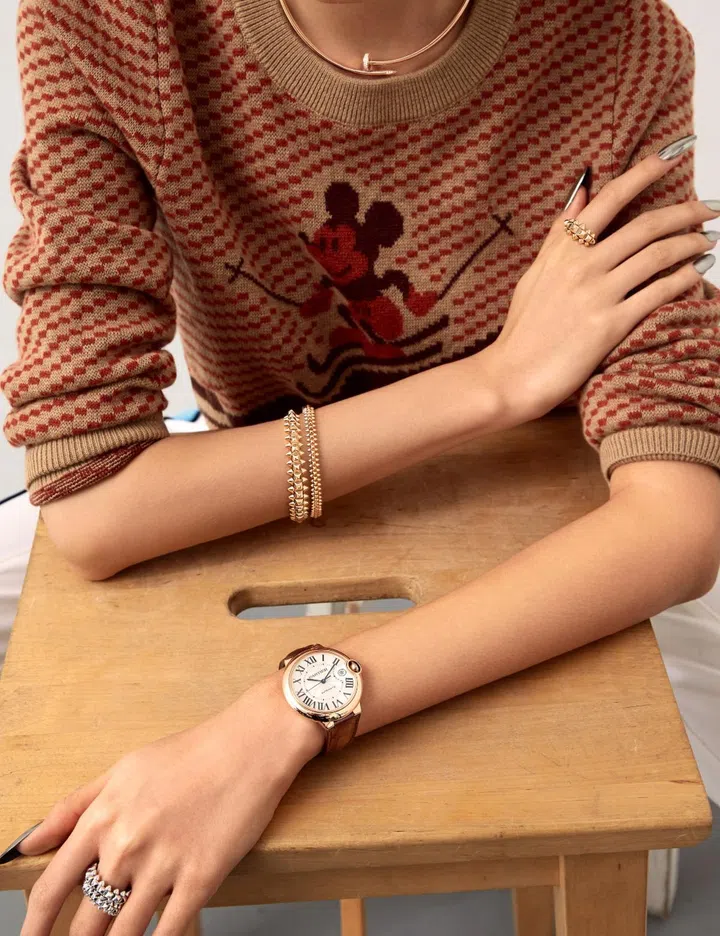 Juste Un Clou pink gold and diamond choker; (on right arm) Clash de Cartier small and large pink gold bracelets and matching large ring; (on left arm) Ballon Bleu de Cartier pink gold watch on leather strap; and Clash de Cartier small and medium white gold rings, Cartier. Wool sweater, Coach
