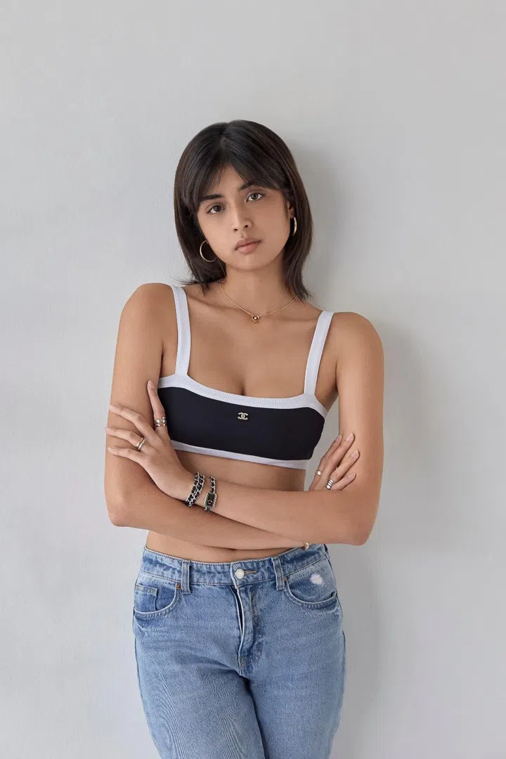 Mardi wears Coco Crush 18K beige gold earrings, matching necklace with diamonds, bracelet (on right wrist) and small ring (on right index finger); (on right ring finger, from top) Coco Crush Toi et Moi 18K white and beige gold small ring, and Coco Crush 18K white gold mini and small rings; (on left wrist) Premiere Rock Triple Row steel and black leather watch; (on left index finger) Coco Crush Toi et Moi 18K white and beige gold large ring, and Coco Crush 18K beige gold mini ring; and (on left ring finger) Coco Crush 18K yellow gold mini ring and matching white gold mini ring with diamonds, Chanel Fine Jewellery. Jersey swimsuit top, Chanel