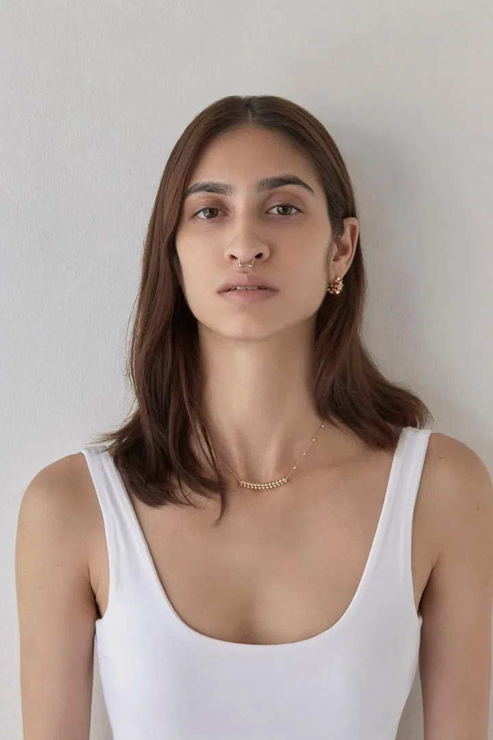 Nametha wears Clash de Cartier pink gold XL single earring and matching small necklace. All Cartier. Septum ring, model’s own. All clothes throughout, model’s own unless otherwise stated