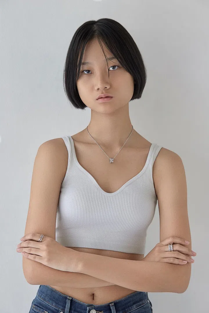 Le Yi wears B.Zero1 New Classic necklace with diamonds, matching ring (on right middle finger) and B.Zero1 Logo Open Work ring, all Bvlgari and in 18k white gold