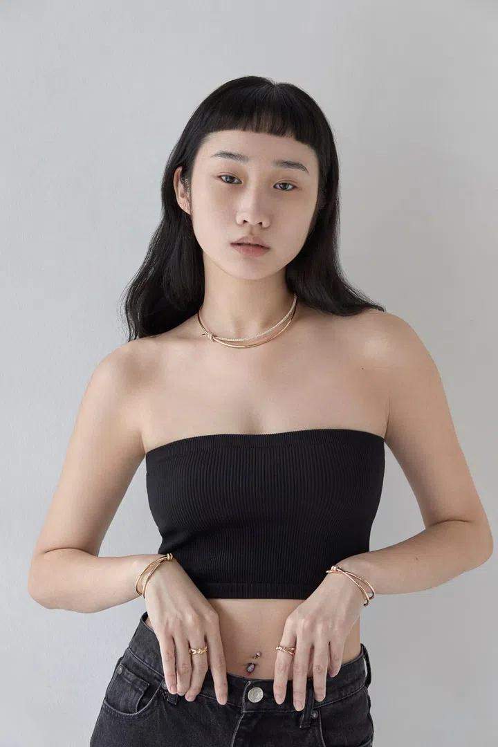 Kaci wears Tiffany Knot 18K yellow gold choker with diamonds; (on right hand) matching bangle and ring; and (on left hand) matching 18K rose gold bangle and ring, Tiffany & Co. Belly ring, model’s own
