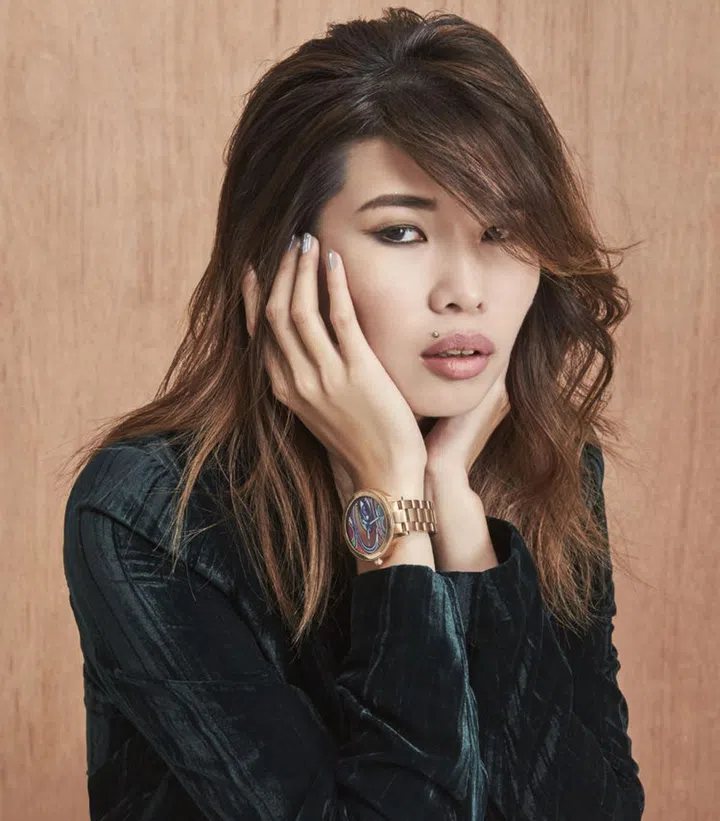 Wong is wearing the Fossil Q Venture smartwatch with an interchangeable rose gold-tone stainless steel bracelet, and a touchscreen digital display that allows you to receive notifications on-the-go and track your activity, whether you’re hiking on a trail, strolling along the beach, or working out at the gym.