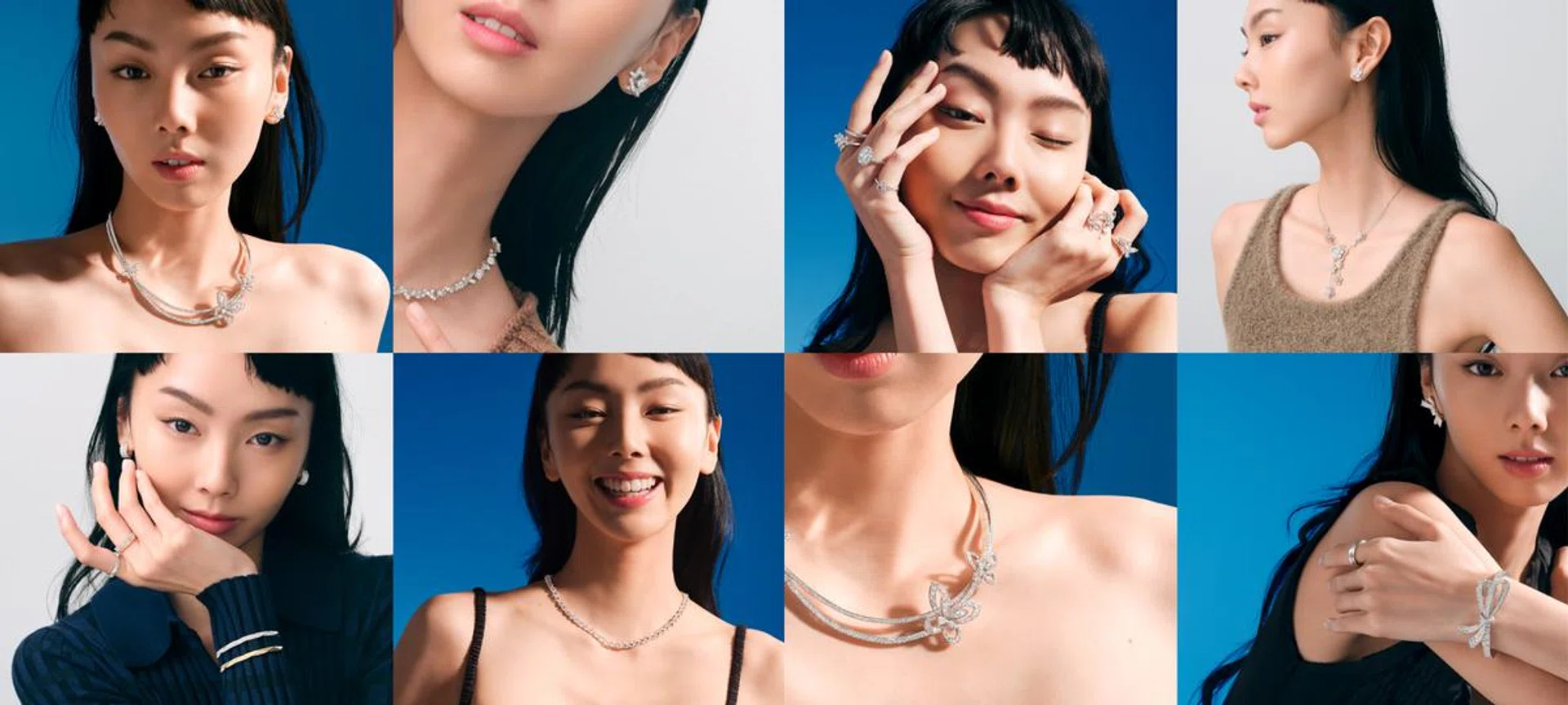 Butterfly Silhouette earrings with round diamonds, and necklace with round diamonds totalling 12.77 carats, Graff. All jewellery throughout in 18k white gold unless otherwise stated. All clothes throughout, stylist's own.