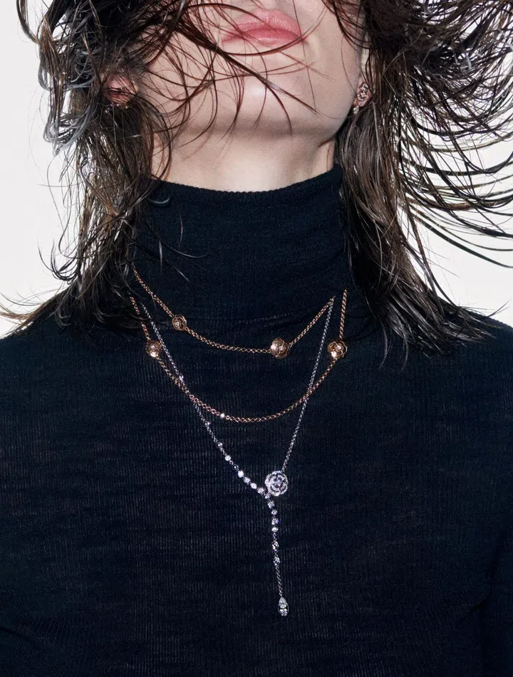 N°5 18K beige gold transformable earring with diamonds (sold as an asymmetrical pair), Les Infinis de Camelia 18K pink gold transformable long necklace with diamonds (worn double looped) and Bouton de Camelia 18K white gold necklace with diamonds